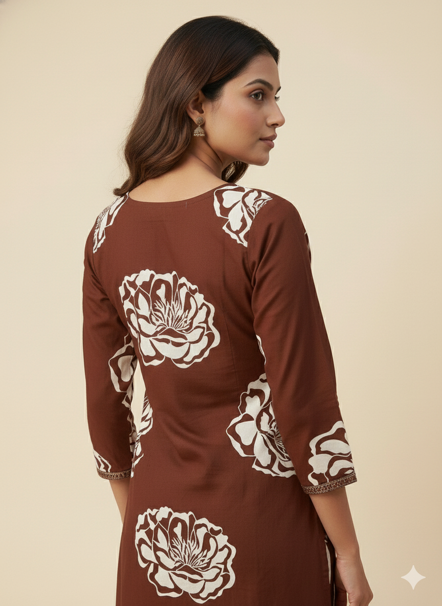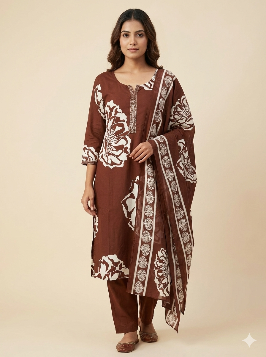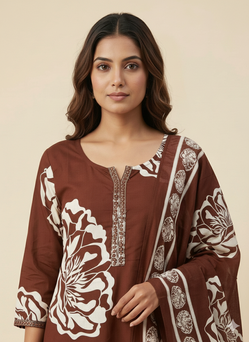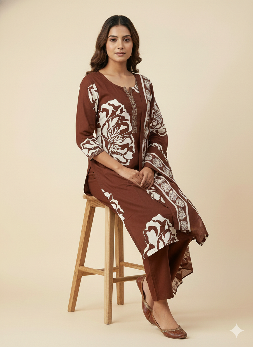 Designed for women who value comfort without compromising on elegance, this chocolate brown kurti pant dupatta set is a perfect choice for everyday and office wear. The rich earthy tone paired with subtle floral prints creates a calm, refined look that feels effortlessly put together.